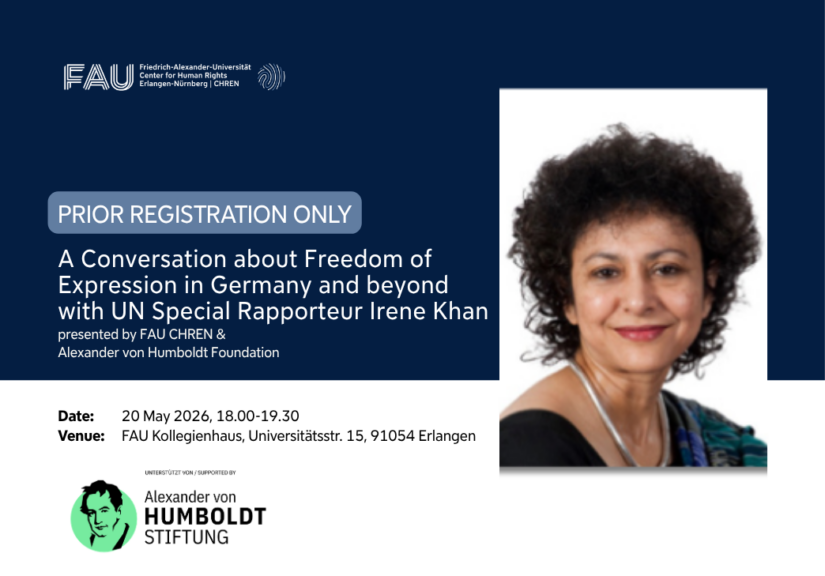 28. April 2026 Allgemein Education Exzellenzcluster Transforming Human Rights News Outreach Presse Research Veranstaltungen Event: UN-Sonderberichterstatterin für Meinungsfreiheit Irene Khan am FAU CHREN Für den 20. Mai 2026 plant das FAU Forschungszentrum Center for Human Rights Erlangen-Nürnberg (FAU CHREN) mit freundlicher Unterstützung der Alexander von Humboldt-Stiftung ein Event mit der renommierten UN-Expertin Irene Khan.…