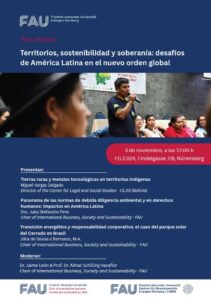 El próximo 3 de noviembre a las 17:00 h, en la sala FG 2.024 (Findelgasse 7/9, Núremberg), se llevará a cabo la mesa redonda titulada “Territorios, sostenibilidad y soberanía: desafíos de América Latina en el nuevo orden global”.