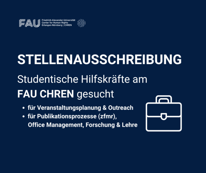 Stellenausschreibung für zwei studentische Hilfskräfte (m/w/d) (voraussichtlich 10 Std./Woche) Das FAU Forschungszentrum Center for Human Rights Erlangen-Nürnberg (CHREN) sucht zum nächstmöglichen Zeitpunkt zunächst für zwölf Monate zwei studentische Hilfskräfte mit…